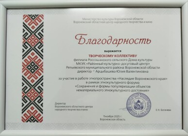 В первый день форума состоялась Научно-практическая конференция «Сохранение этнокультурного достояния: региональный опыт и перспективы», была организована выставка «Народные костюмы Воронежской области», затем работа форума продолжилась на площадке Рамонского районного Дома культуры, в котором было открыто этнопространство «Наследие Воронежского края» с демонстрацией объектов нематериального этнокультурного достояния. Творческий коллектив Россошанского сельского Дома культуры, а также руководитель народного фольклорного ансамбля «Завалинка» Любовь Корчагина представили Репьевский муниципальный район и приняли участие в научно-практической конференции. В работе Форума был представлен мастер-класс и дегустация брендового блюда села Россошь катанка, объекта нематериального этнокультурного достояния, включённого в реестры Воронежской области и Российской федерации ( Любовь Быковская и участницы Народного фольклорно- этнографического ансамбля села Россошь Надежда Данилова и Нина Батищева).