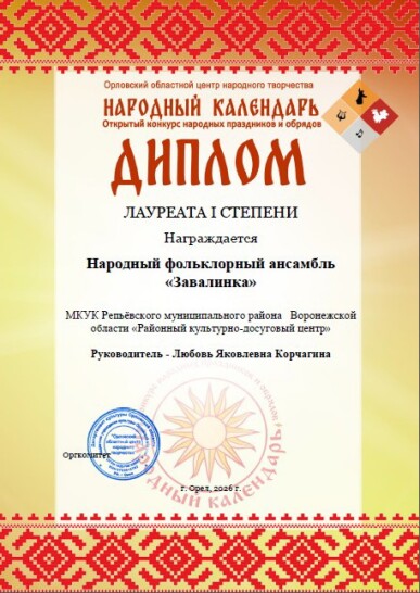 Народный фольклорный ансамбль «ЗАВАЛИНКА» МКУК «Районный культурно-досуговый центр» (руководитель Л.Корчагина) принял участие в открытом конкурсе народных праздников и обрядов «Народный календарь», проводимый Орловским областным центром народного творчества при содействии Департамента культуры Орловской области. По итогам рассмотрения конкурсных материалов коллектив был удостоен диплома Лауреата 1 степени и благодарственного письма, в котором был отмечен высокий уровень мастерства, преданность культуре и бесценный вклад в сохранение народного наследия участницами ансамбля «Завалинка».