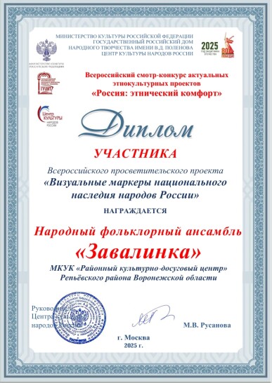 Творческие коллективы районного Дома культуры- народный театр миниатюр (руководитель –Данилова Т.В.) и народный фольклорный ансамбль «Завалинка» (руководитель –Корчагина Л.Я.) приняли участие во Всероссийском просветительском проекте «Визуальные маркеры национального наследия народов России», организованным Государственным Российским Домом народного творчества имени В.Д. Поленова. Цель проекта — сохранить уникальное многообразие языков и национальных традиций народов России, укрепив культурные связи и гражданское единство нашей страны.