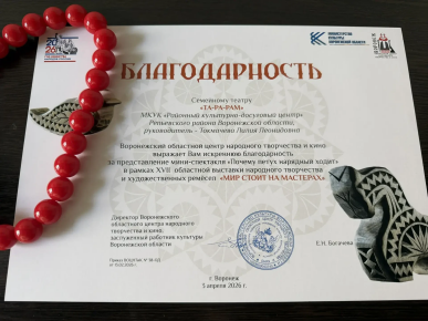 3 апреля в г. Воронеже в выставочном зале в рамках областной выставки народного творчества и художественных ремесел "Мир стоит на мастерах" семейный театр "Та- ра- рам" (руководитель Л. Токмачева) представил зрителям мини-спектакль "Почему петух нарядный"
